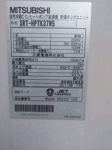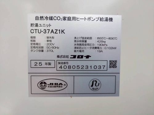 豊中市岡町 三菱電機自然冷媒CO2ヒートポンプ給湯機 貯湯タンクユニットSRT-HPTK37W5→コロナ自然冷媒CO2家庭用ヒートポンプ給湯機ヒートポンプユニットCHP-DZ451K、貯湯ユニットCTU-37AZ1K エコキュート交換工事