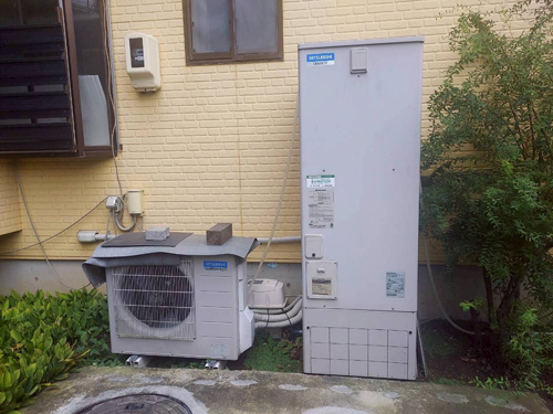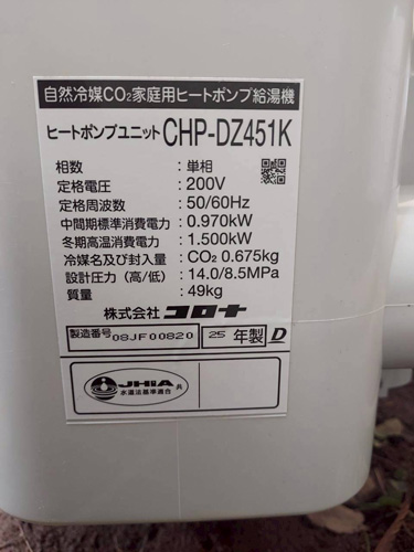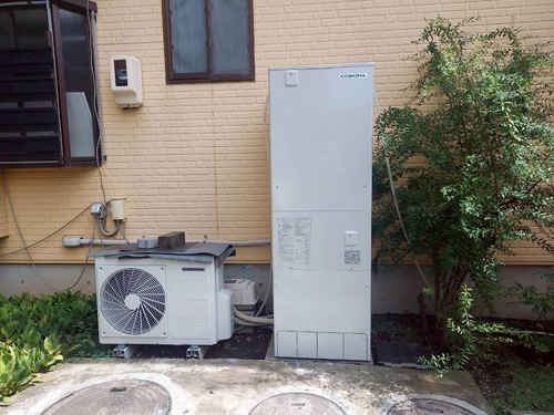豊中市岡町 コロナ自然冷媒CO2家庭用ヒートポンプ給湯機ヒートポンプユニットCHP-DZ451K、貯湯ユニットCTU-37AZ1K エコキュート交換工事